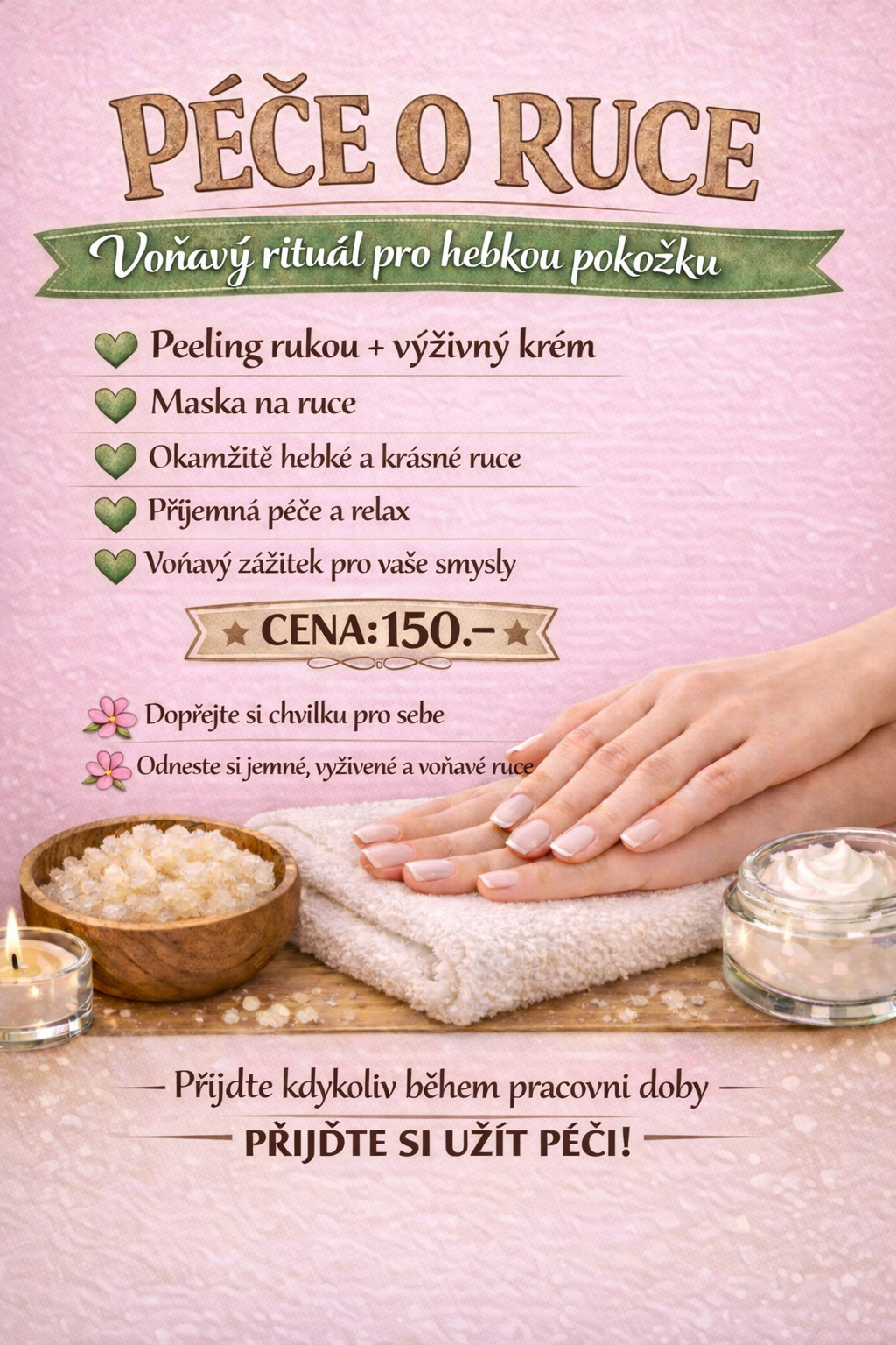 Čeká Vás příjemná péče o ruce, která spojí jemnost doteku, sílu přírody a chvíli klidu jen pro Vás.